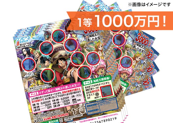 「ワンピーススクラッチ」をお楽しみください!今月は3種類でのスタートです! 「ワンピーススクラッチ ルフィ タテ・ヨコ・ナナメ」は、1等賞金100万円で16日(火)まで4ブロックで発売中! ②300円スクラッチの例 ただ、ワンピーススクラッチ ナミ2 レンゾク3(近畿)とワンピーススクラッチ サボ2 ハッピーカウント(全国)は、どちらも0円なので50枚購入して1万円になります。 もしかしたら3等が当たる前に2等の5万円(当選本数900本)が当たる確率もありますよね。 →第0回ワンピーススクラッチ エースにチャレンジ! 1等1000万円の高額当選をゲットするには、当選確率1/50万を突破する必要がありますが果たしてどんな結末を迎えたのか? ぜひご覧になって下さい。
