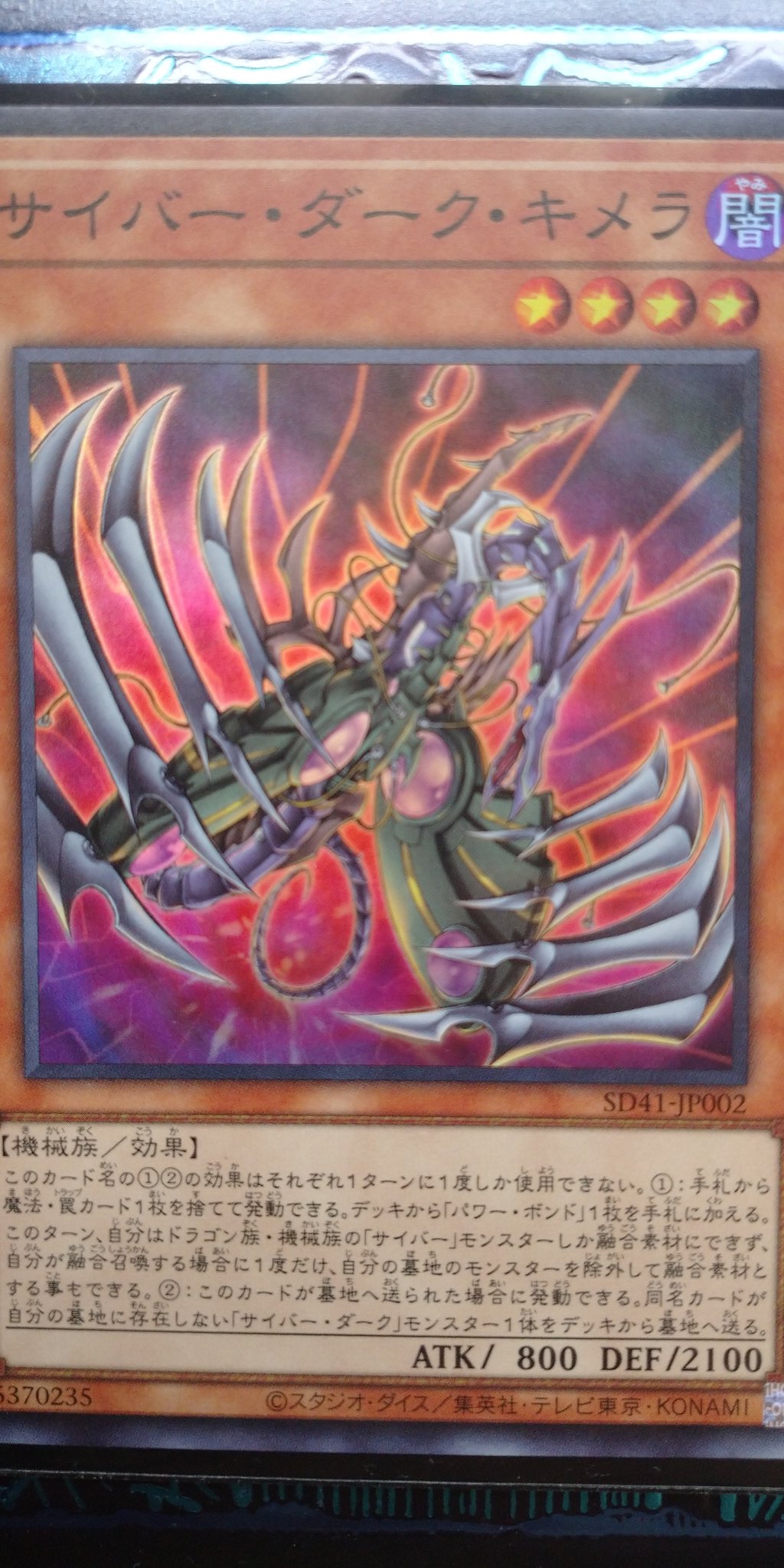 ダーク キメラ-サイバー・ダーク・キメラ 2 最強魔法パワーボンドをサーチできるヤバい奴 おまけに墓地融合もできるようになる コストがかかるので2積み サイバー・ダーク・クロー 3 魔法トラップサーチ 優秀なサーチ要員なので3積み サイバー・ダーク・エッジ 1カード名:サイバー・ダーク・キメラ 効果モンスタースーパーレア 星4/闇属性/機械族/攻:800/守:2100/ このカード名の(1)(2)の効果はそれぞれ1ターンに1度しか使用できない。 (1):手札から魔法・罠カード1枚を捨てて発動できる。